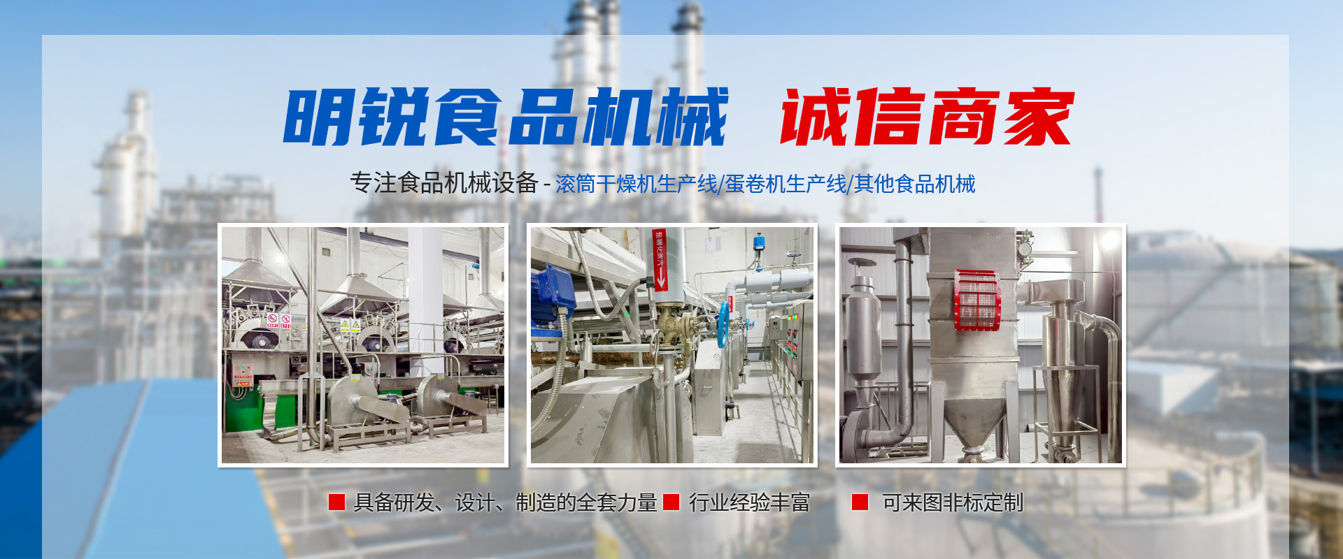 東臺市明銳食品機械有限公司是一個從事食品機械設備設計、制造和安裝調試的專業廠家,在食品生產工藝、生產流程及設備設計和制造有著多年豐富經驗。主要產品有蛋卷機生產系列,滾筒干燥機生產線系列以及其他食品機械。目前各種生產線規格齊全,國內技術優良,產品遠銷亞洲各國及國內二十多個省市自治區。